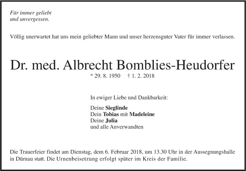 Hier finden Sie alle Traueranzeigen aus der Zeitung, die bisher für Albrecht Bomblies-Heudorfer erschienen sind. Weitere Traueranzeigen, die in der Zeitung erscheinen, werden hier ebenfalls aufgelistet