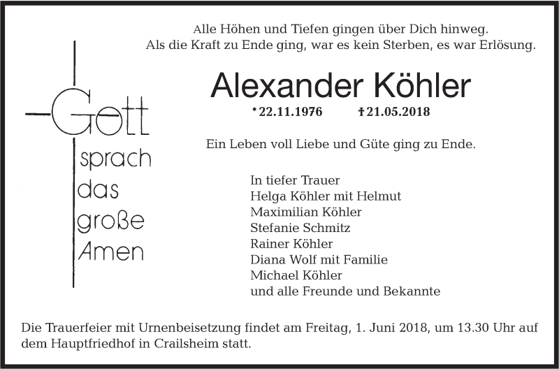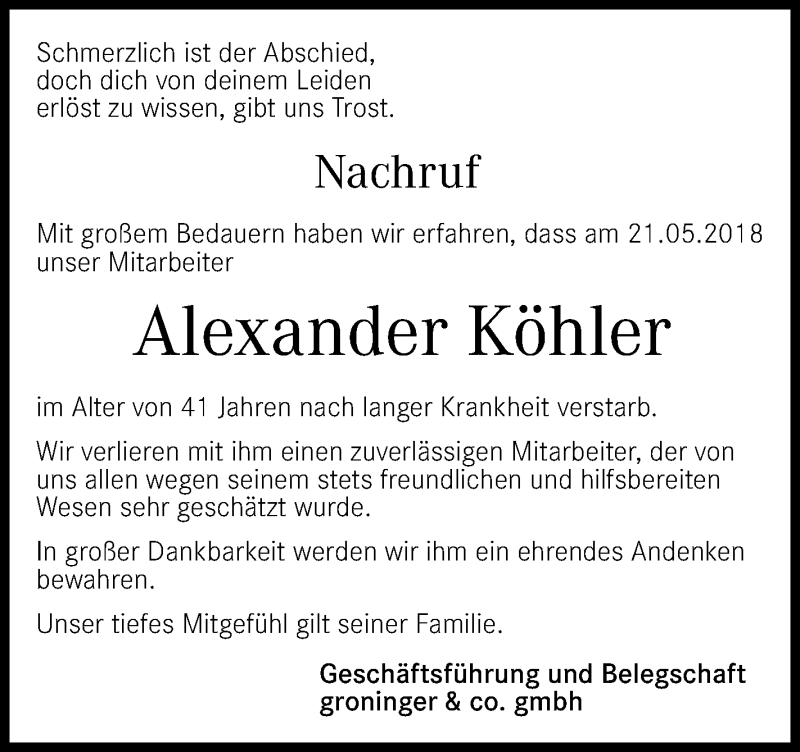 Hier finden Sie alle Traueranzeigen aus der Zeitung, die bisher für Alexander Köhler erschienen sind. Weitere Traueranzeigen, die in der Zeitung erscheinen, werden hier ebenfalls aufgelistet