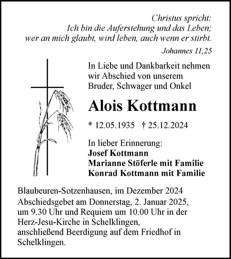 Hier finden Sie alle Traueranzeigen aus der Zeitung, die bisher für Alois Kottmann erschienen sind. Weitere Traueranzeigen, die in der Zeitung erscheinen, werden hier ebenfalls aufgelistet