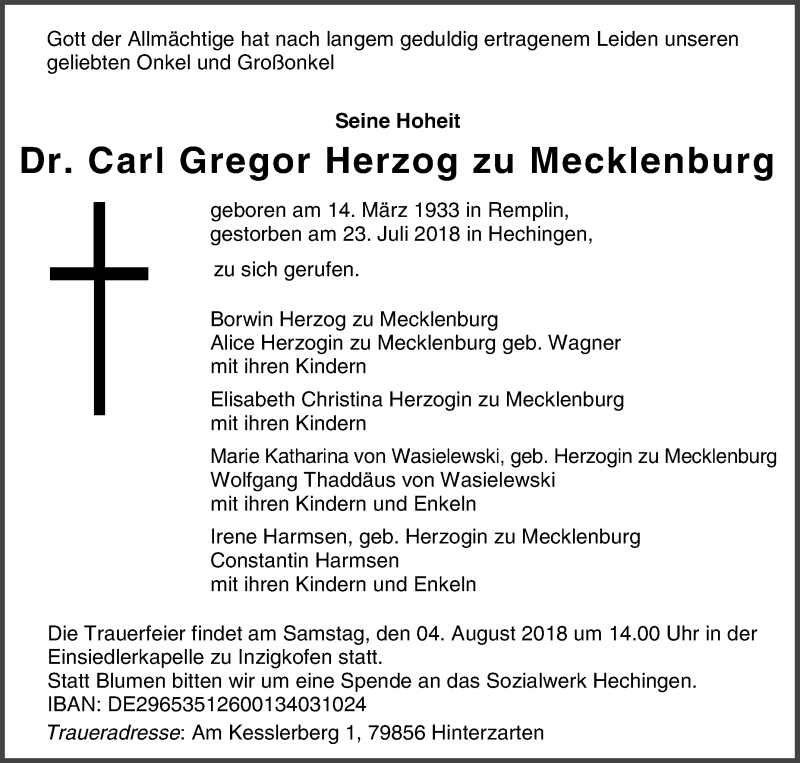 Hier finden Sie alle Traueranzeigen aus der Zeitung, die bisher für Carl Gregor Herzog zu Mecklenburg erschienen sind. Weitere Traueranzeigen, die in der Zeitung erscheinen, werden hier ebenfalls aufgelistet