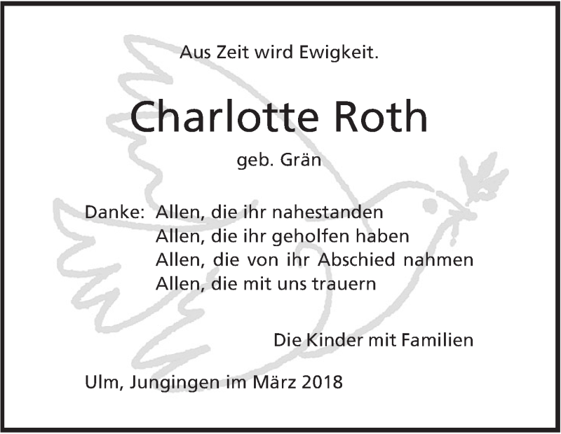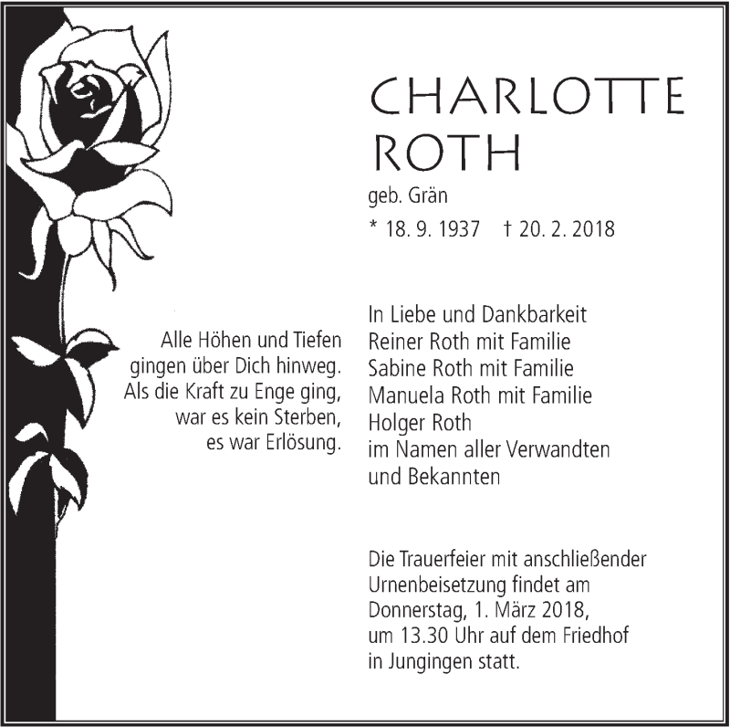 Hier finden Sie alle Traueranzeigen aus der Zeitung, die bisher für Charlotte Roth erschienen sind. Weitere Traueranzeigen, die in der Zeitung erscheinen, werden hier ebenfalls aufgelistet