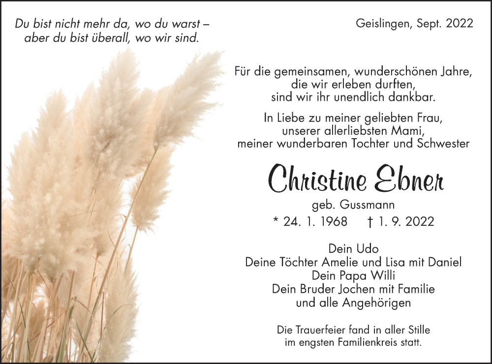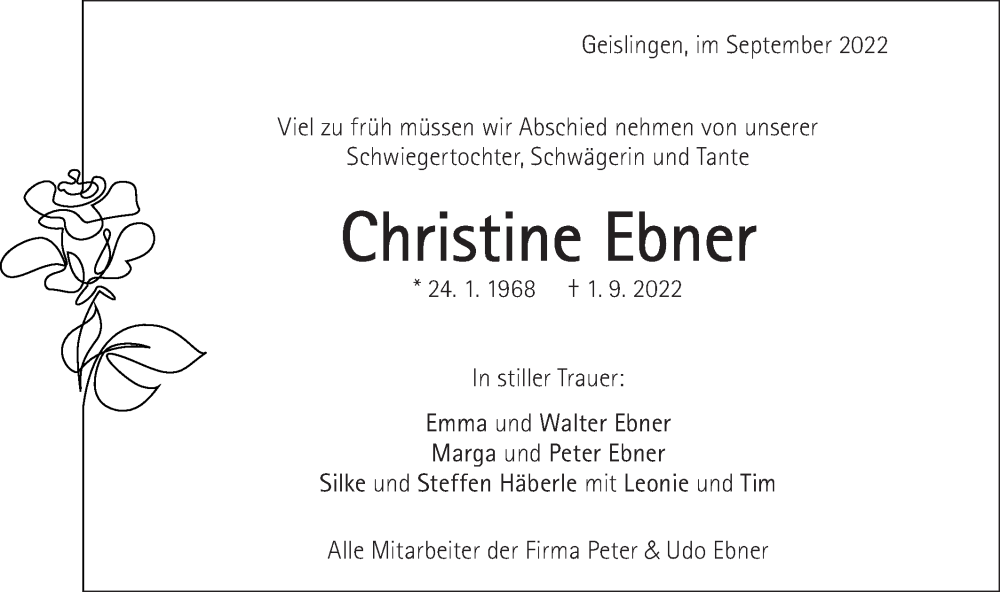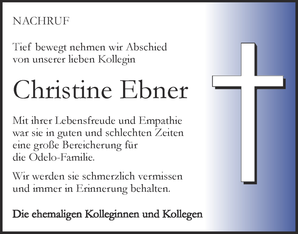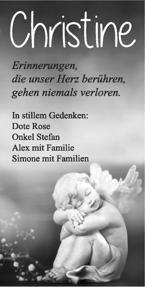Hier finden Sie alle Traueranzeigen aus der Zeitung, die bisher für Christine Ebner erschienen sind. Weitere Traueranzeigen, die in der Zeitung erscheinen, werden hier ebenfalls aufgelistet