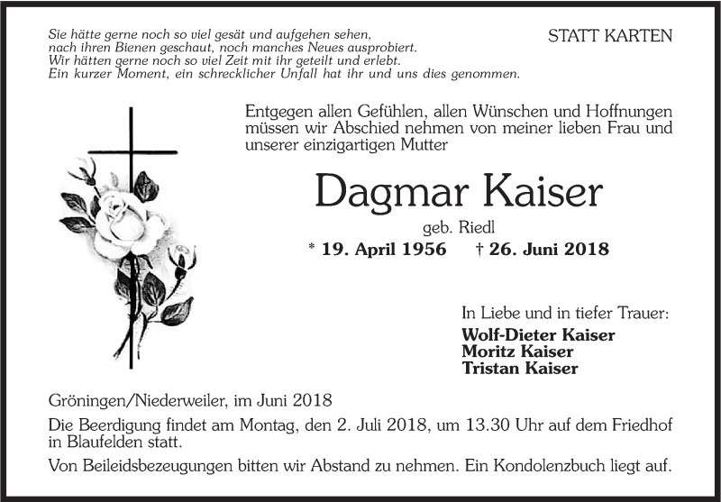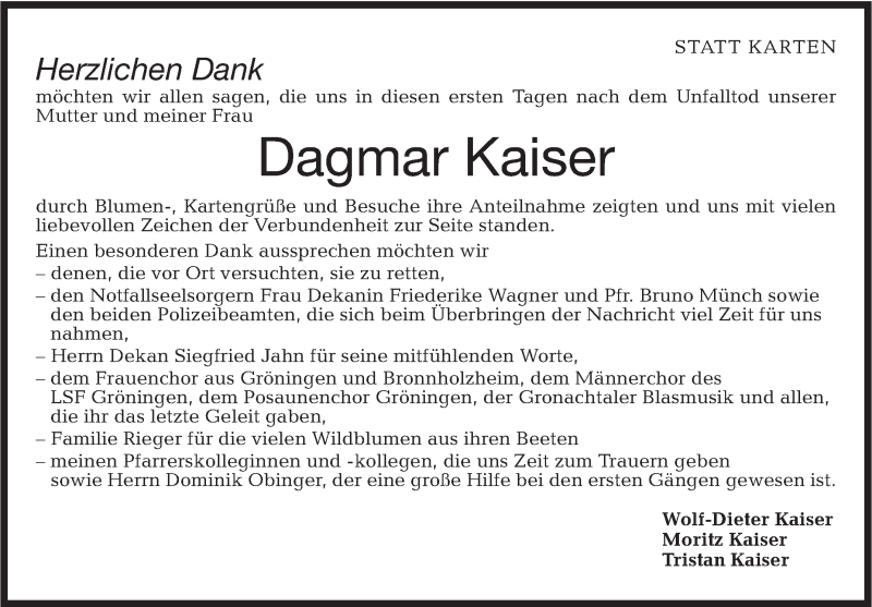 Hier finden Sie alle Traueranzeigen aus der Zeitung, die bisher für Dagmar Kaiser erschienen sind. Weitere Traueranzeigen, die in der Zeitung erscheinen, werden hier ebenfalls aufgelistet