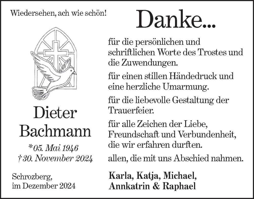 Hier finden Sie alle Traueranzeigen aus der Zeitung, die bisher für Dieter Bachmann erschienen sind. Weitere Traueranzeigen, die in der Zeitung erscheinen, werden hier ebenfalls aufgelistet