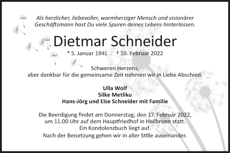 Hier finden Sie alle Traueranzeigen aus der Zeitung, die bisher für Dietmar Schneider erschienen sind. Weitere Traueranzeigen, die in der Zeitung erscheinen, werden hier ebenfalls aufgelistet