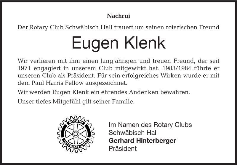 Hier finden Sie alle Traueranzeigen aus der Zeitung, die bisher für Eugen Klenk erschienen sind. Weitere Traueranzeigen, die in der Zeitung erscheinen, werden hier ebenfalls aufgelistet