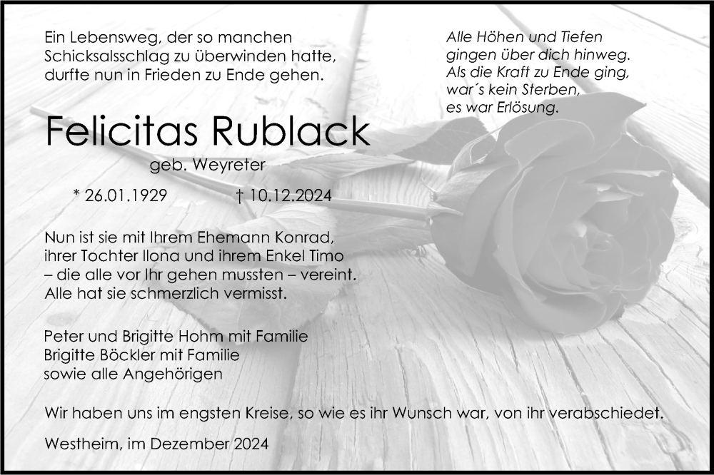 Hier finden Sie alle Traueranzeigen aus der Zeitung, die bisher für Felicitas Rublack erschienen sind. Weitere Traueranzeigen, die in der Zeitung erscheinen, werden hier ebenfalls aufgelistet