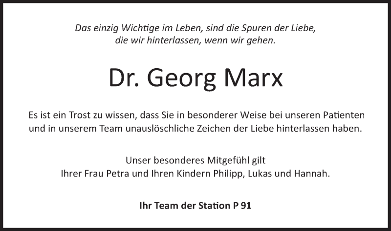 Hier finden Sie alle Traueranzeigen aus der Zeitung, die bisher für Georg Marx erschienen sind. Weitere Traueranzeigen, die in der Zeitung erscheinen, werden hier ebenfalls aufgelistet