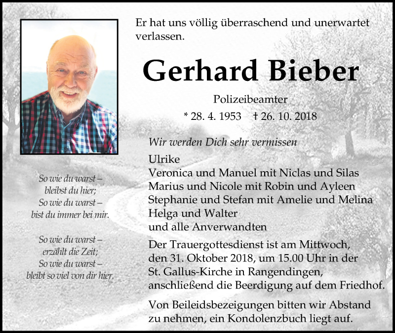 Hier finden Sie alle Traueranzeigen aus der Zeitung, die bisher für Gerhard Bieber erschienen sind. Weitere Traueranzeigen, die in der Zeitung erscheinen, werden hier ebenfalls aufgelistet