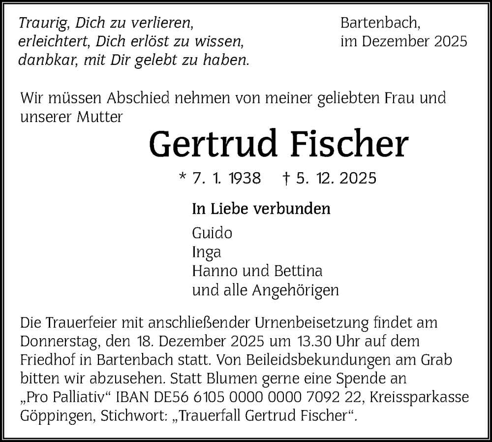 Hier finden Sie alle Traueranzeigen aus der Zeitung, die bisher für Gertrud Fischer erschienen sind. Weitere Traueranzeigen, die in der Zeitung erscheinen, werden hier ebenfalls aufgelistet