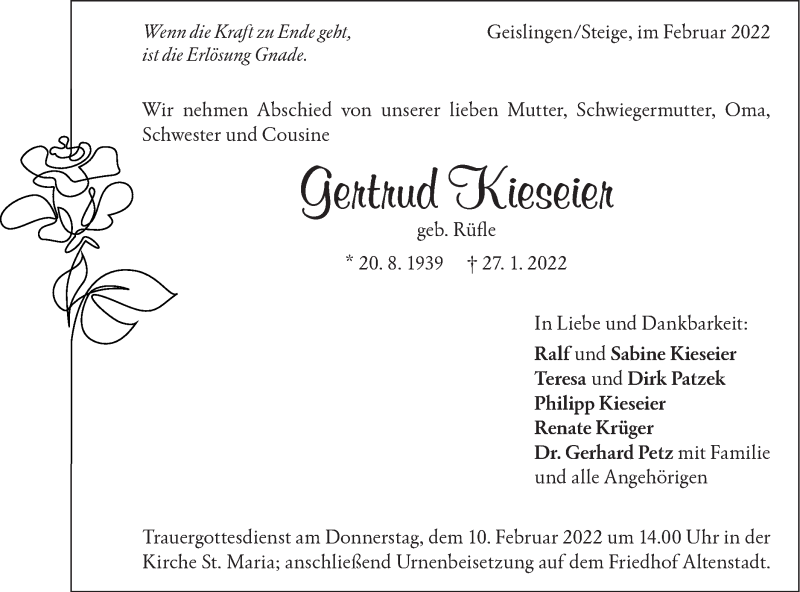 Hier finden Sie alle Traueranzeigen aus der Zeitung, die bisher für Gertrud Kieseier erschienen sind. Weitere Traueranzeigen, die in der Zeitung erscheinen, werden hier ebenfalls aufgelistet