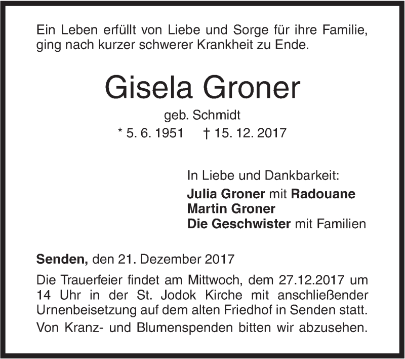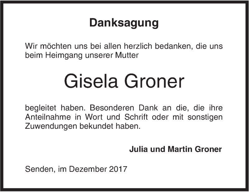 Hier finden Sie alle Traueranzeigen aus der Zeitung, die bisher für Gisela Groner erschienen sind. Weitere Traueranzeigen, die in der Zeitung erscheinen, werden hier ebenfalls aufgelistet