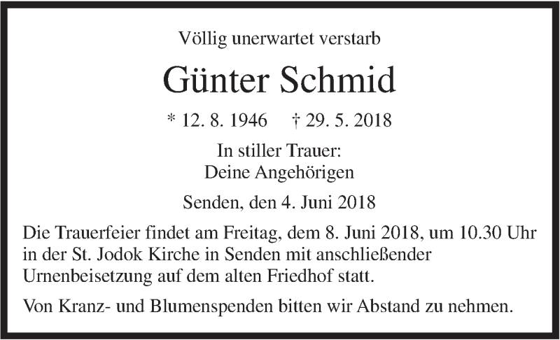 Hier finden Sie alle Traueranzeigen aus der Zeitung, die bisher für Günter Schmid erschienen sind. Weitere Traueranzeigen, die in der Zeitung erscheinen, werden hier ebenfalls aufgelistet