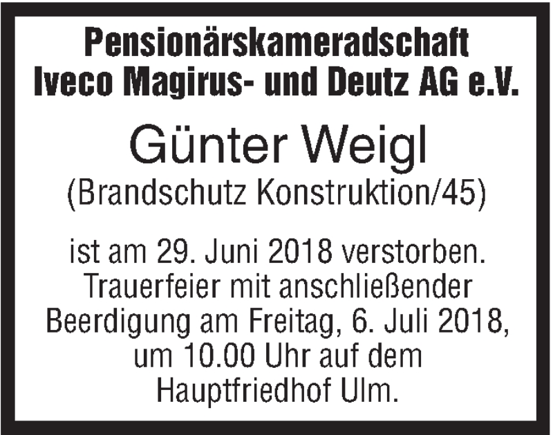 Hier finden Sie alle Traueranzeigen aus der Zeitung, die bisher für Günter Weigl erschienen sind. Weitere Traueranzeigen, die in der Zeitung erscheinen, werden hier ebenfalls aufgelistet