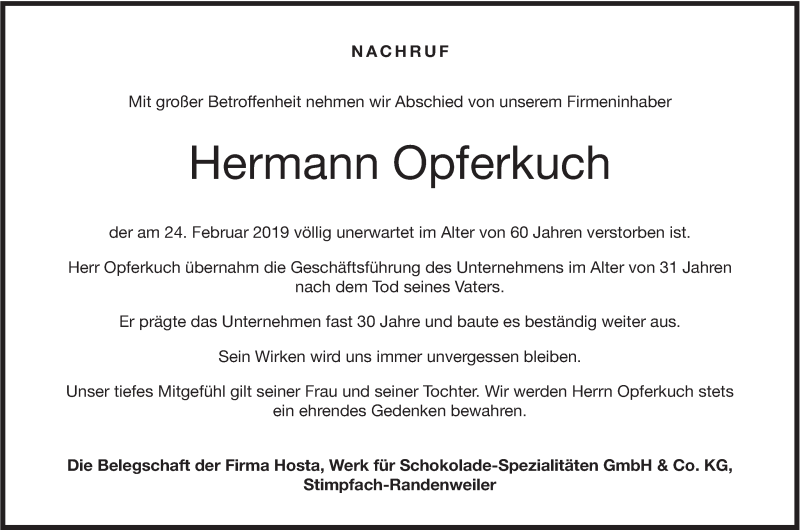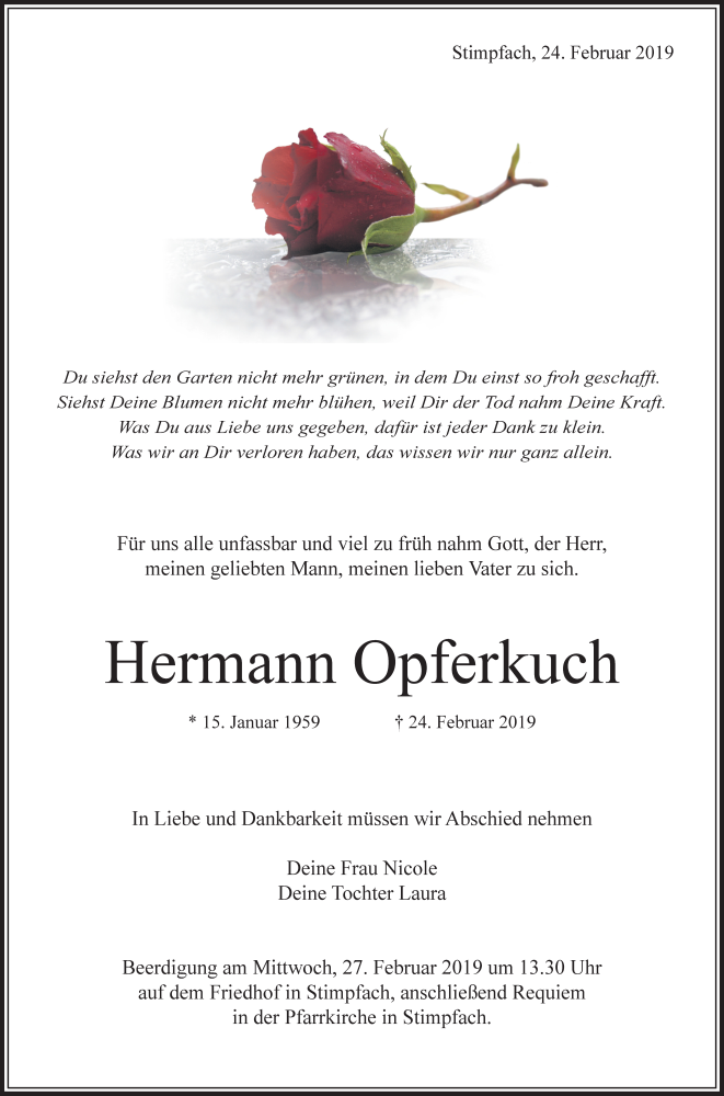 Hier finden Sie alle Traueranzeigen aus der Zeitung, die bisher für Hermann Opferkuch erschienen sind. Weitere Traueranzeigen, die in der Zeitung erscheinen, werden hier ebenfalls aufgelistet