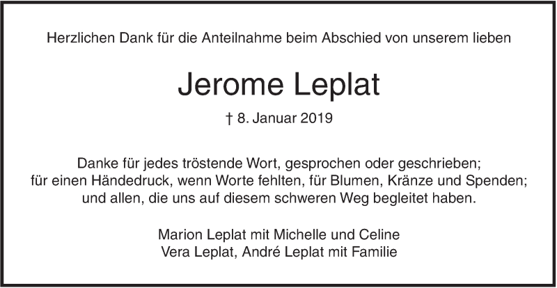 Hier finden Sie alle Traueranzeigen aus der Zeitung, die bisher für Jerome Leplat erschienen sind. Weitere Traueranzeigen, die in der Zeitung erscheinen, werden hier ebenfalls aufgelistet