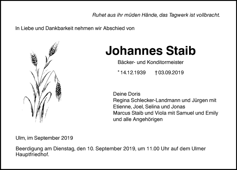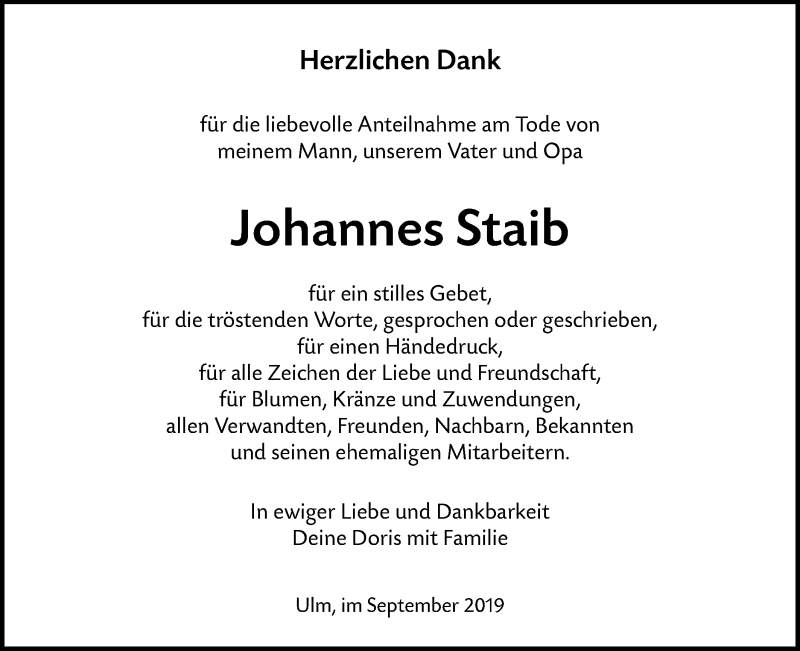 Hier finden Sie alle Traueranzeigen aus der Zeitung, die bisher für Johannes Staib erschienen sind. Weitere Traueranzeigen, die in der Zeitung erscheinen, werden hier ebenfalls aufgelistet