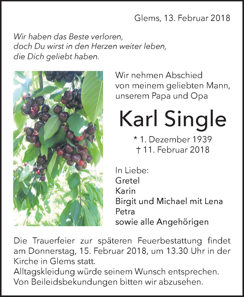 Hier finden Sie alle Traueranzeigen aus der Zeitung, die bisher für Karl Single erschienen sind. Weitere Traueranzeigen, die in der Zeitung erscheinen, werden hier ebenfalls aufgelistet