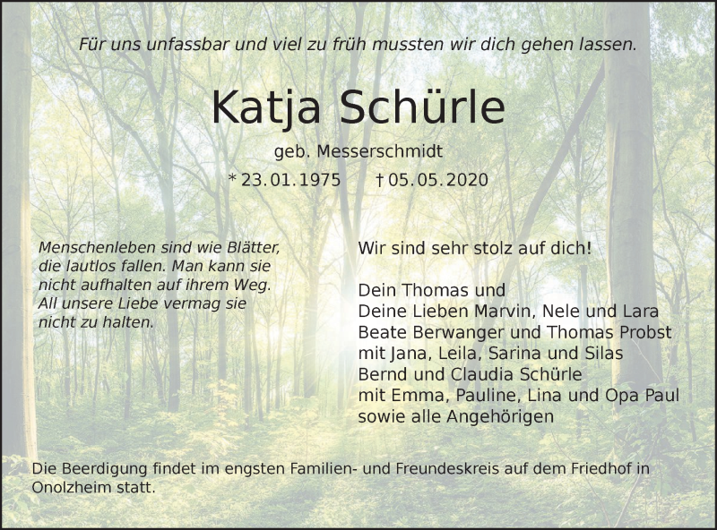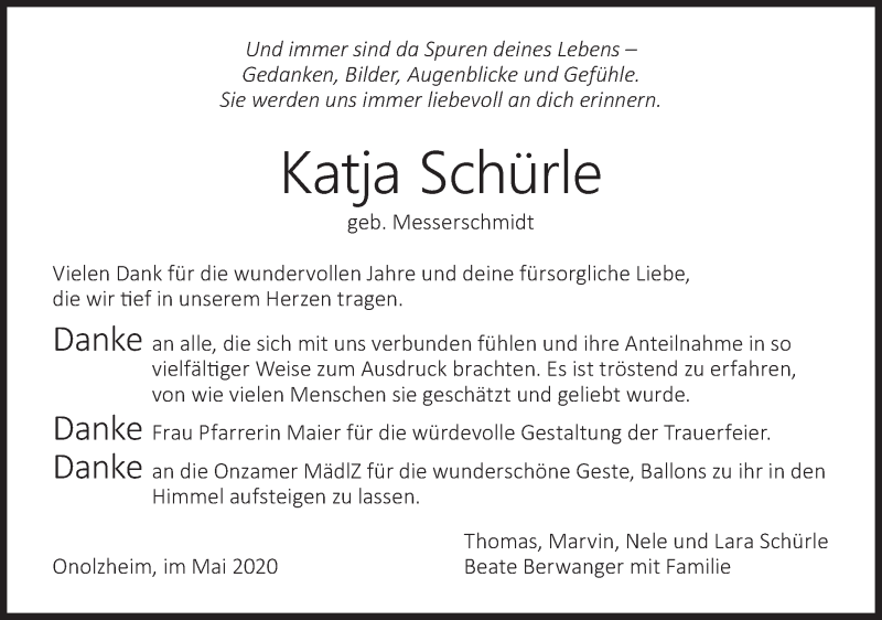 Hier finden Sie alle Traueranzeigen aus der Zeitung, die bisher für Katja Schürle erschienen sind. Weitere Traueranzeigen, die in der Zeitung erscheinen, werden hier ebenfalls aufgelistet
