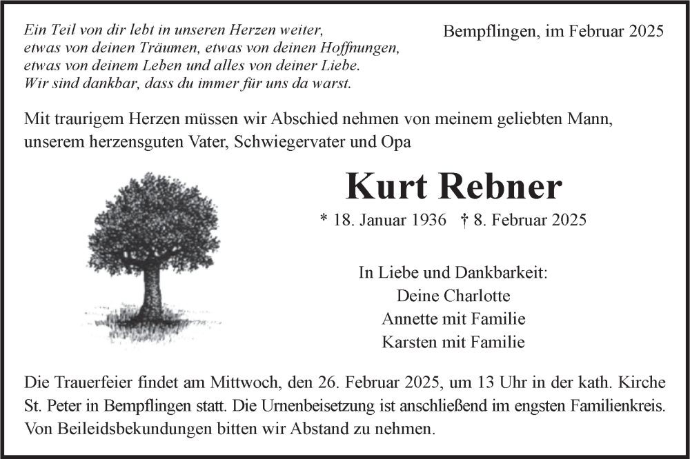 Hier finden Sie alle Traueranzeigen aus der Zeitung, die bisher für Kurt Rebner erschienen sind. Weitere Traueranzeigen, die in der Zeitung erscheinen, werden hier ebenfalls aufgelistet