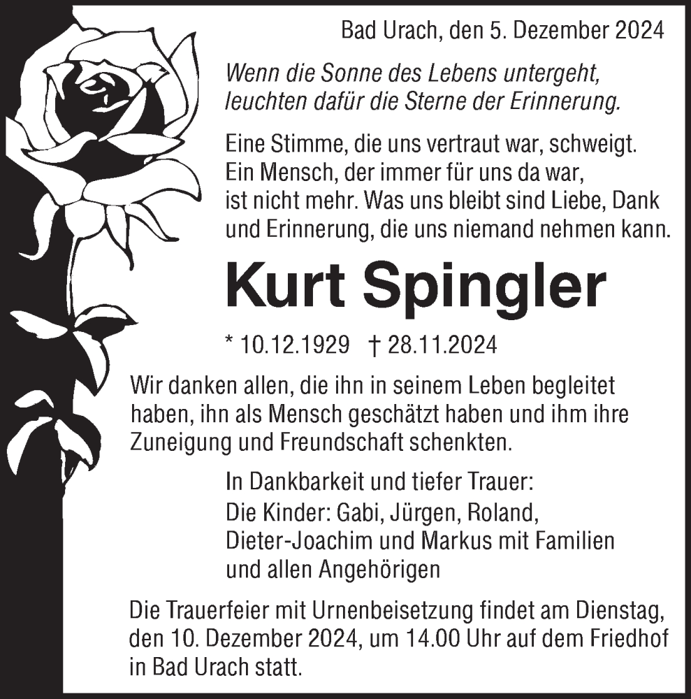 Hier finden Sie alle Traueranzeigen aus der Zeitung, die bisher für Kurt Spingler erschienen sind. Weitere Traueranzeigen, die in der Zeitung erscheinen, werden hier ebenfalls aufgelistet
