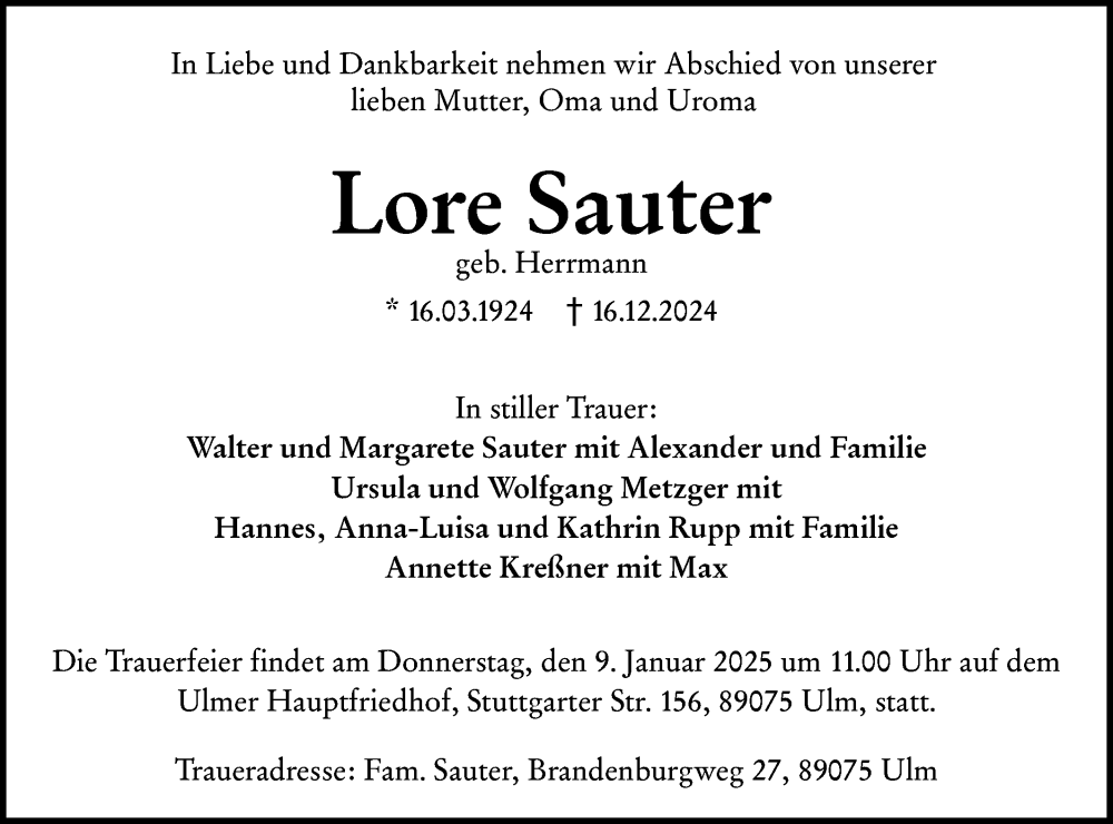Hier finden Sie alle Traueranzeigen aus der Zeitung, die bisher für Lore Sauter erschienen sind. Weitere Traueranzeigen, die in der Zeitung erscheinen, werden hier ebenfalls aufgelistet