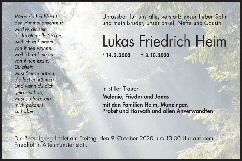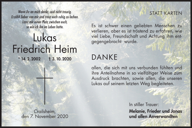 Hier finden Sie alle Traueranzeigen aus der Zeitung, die bisher für Lukas Friedrich Heim erschienen sind. Weitere Traueranzeigen, die in der Zeitung erscheinen, werden hier ebenfalls aufgelistet