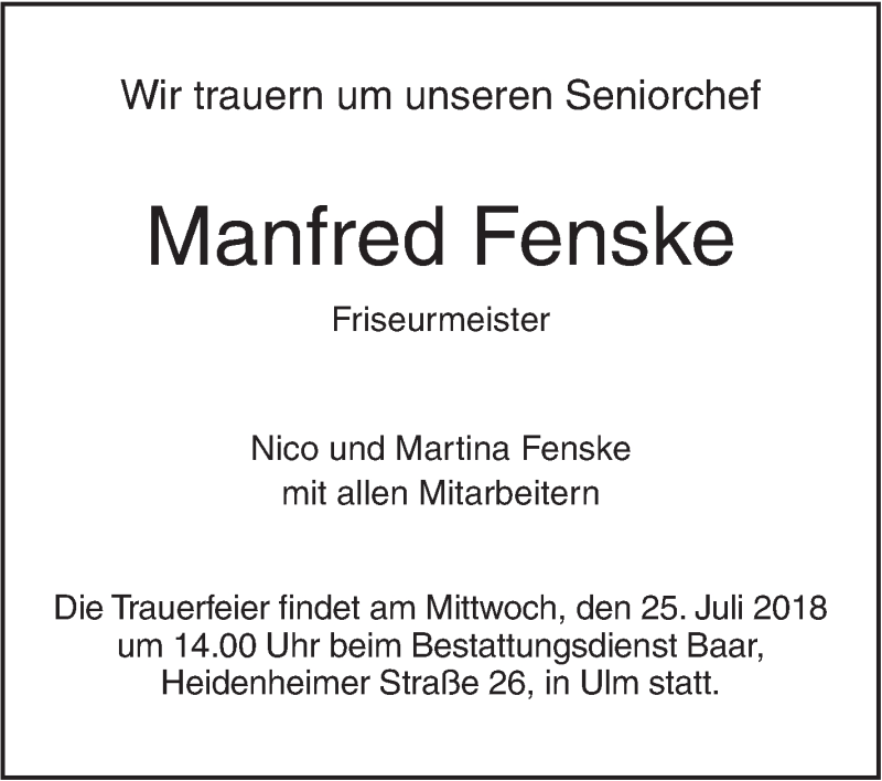Hier finden Sie alle Traueranzeigen aus der Zeitung, die bisher für Manfred Fenske erschienen sind. Weitere Traueranzeigen, die in der Zeitung erscheinen, werden hier ebenfalls aufgelistet