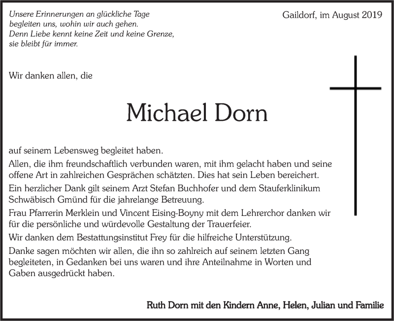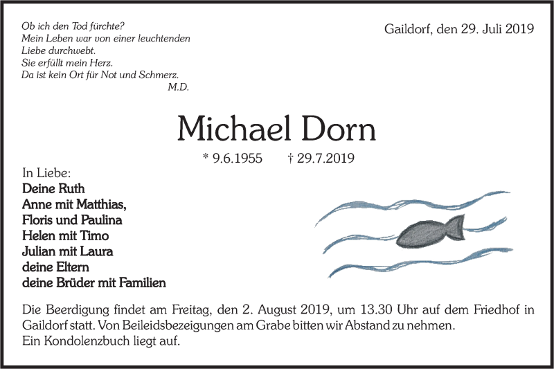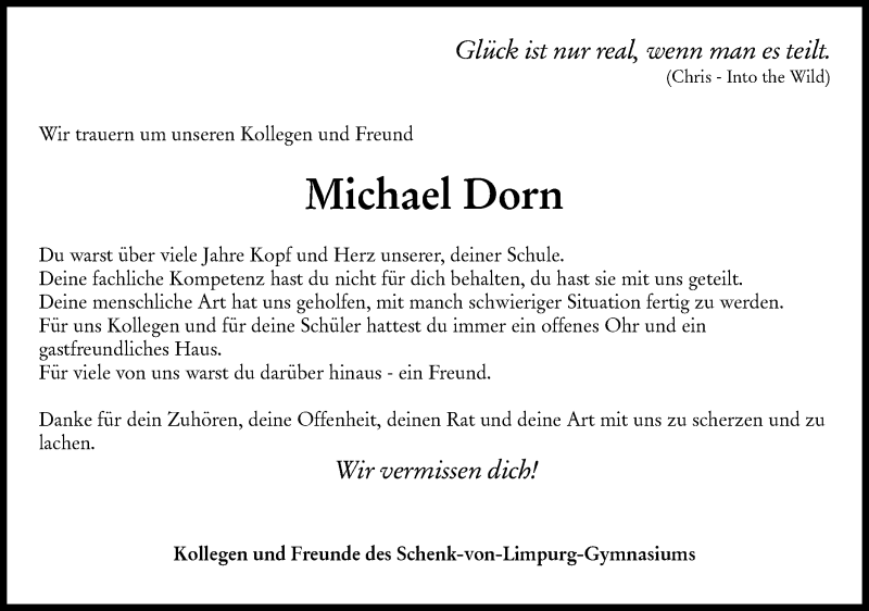Hier finden Sie alle Traueranzeigen aus der Zeitung, die bisher für Michael Dorn erschienen sind. Weitere Traueranzeigen, die in der Zeitung erscheinen, werden hier ebenfalls aufgelistet