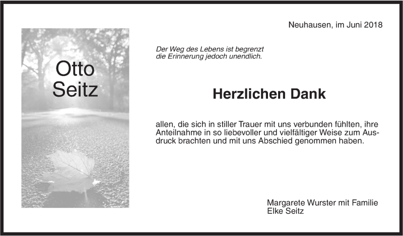 Hier finden Sie alle Traueranzeigen aus der Zeitung, die bisher für Otto Seitz erschienen sind. Weitere Traueranzeigen, die in der Zeitung erscheinen, werden hier ebenfalls aufgelistet