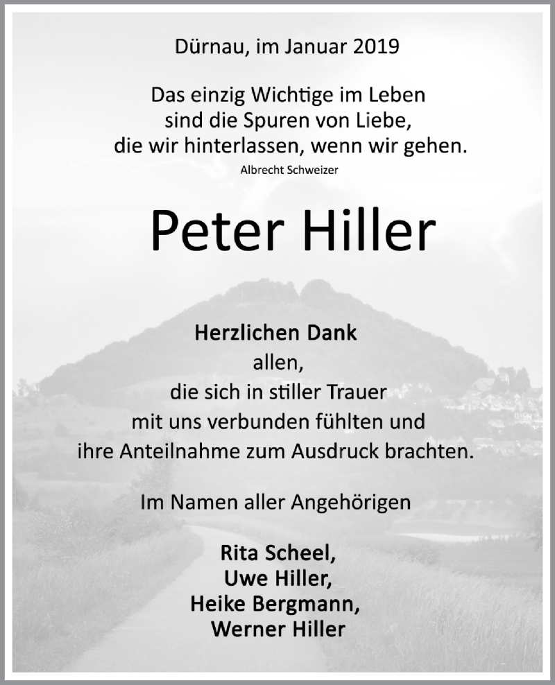 Hier finden Sie alle Traueranzeigen aus der Zeitung, die bisher für Peter Hiller erschienen sind. Weitere Traueranzeigen, die in der Zeitung erscheinen, werden hier ebenfalls aufgelistet