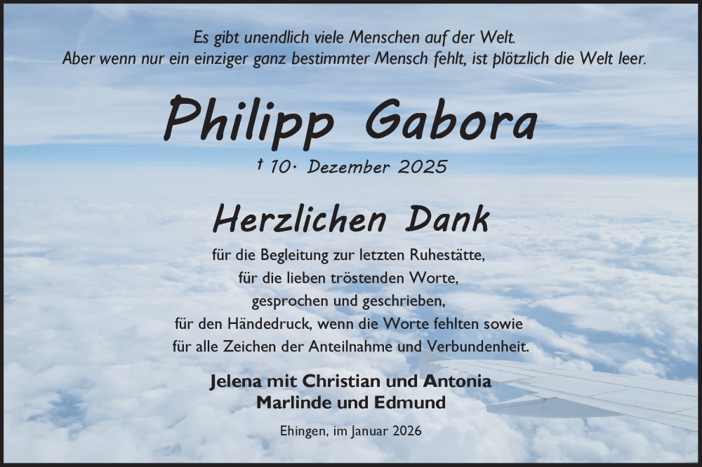 Hier finden Sie alle Traueranzeigen aus der Zeitung, die bisher für Philipp Gabora erschienen sind. Weitere Traueranzeigen, die in der Zeitung erscheinen, werden hier ebenfalls aufgelistet
