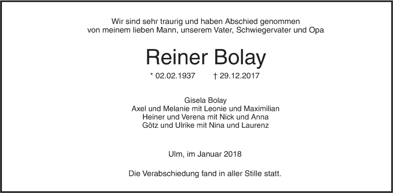 Hier finden Sie alle Traueranzeigen aus der Zeitung, die bisher für Reiner Bolay erschienen sind. Weitere Traueranzeigen, die in der Zeitung erscheinen, werden hier ebenfalls aufgelistet