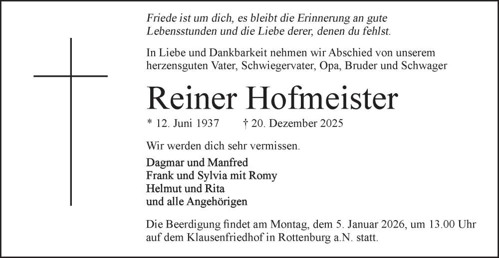 Hier finden Sie alle Traueranzeigen aus der Zeitung, die bisher für Reiner Hofmeister erschienen sind. Weitere Traueranzeigen, die in der Zeitung erscheinen, werden hier ebenfalls aufgelistet