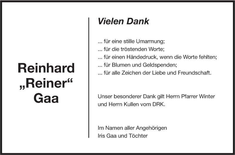 Hier finden Sie alle Traueranzeigen aus der Zeitung, die bisher für Reinhard Gaa erschienen sind. Weitere Traueranzeigen, die in der Zeitung erscheinen, werden hier ebenfalls aufgelistet