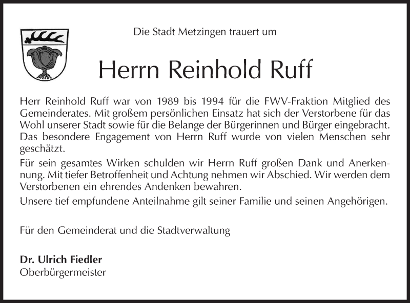 Hier finden Sie alle Traueranzeigen aus der Zeitung, die bisher für Reinhold Ruff erschienen sind. Weitere Traueranzeigen, die in der Zeitung erscheinen, werden hier ebenfalls aufgelistet