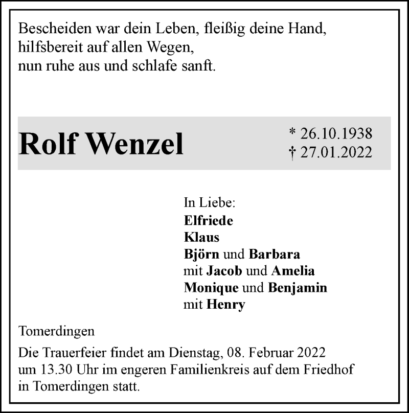 Hier finden Sie alle Traueranzeigen aus der Zeitung, die bisher für Rolf Wenzel erschienen sind. Weitere Traueranzeigen, die in der Zeitung erscheinen, werden hier ebenfalls aufgelistet