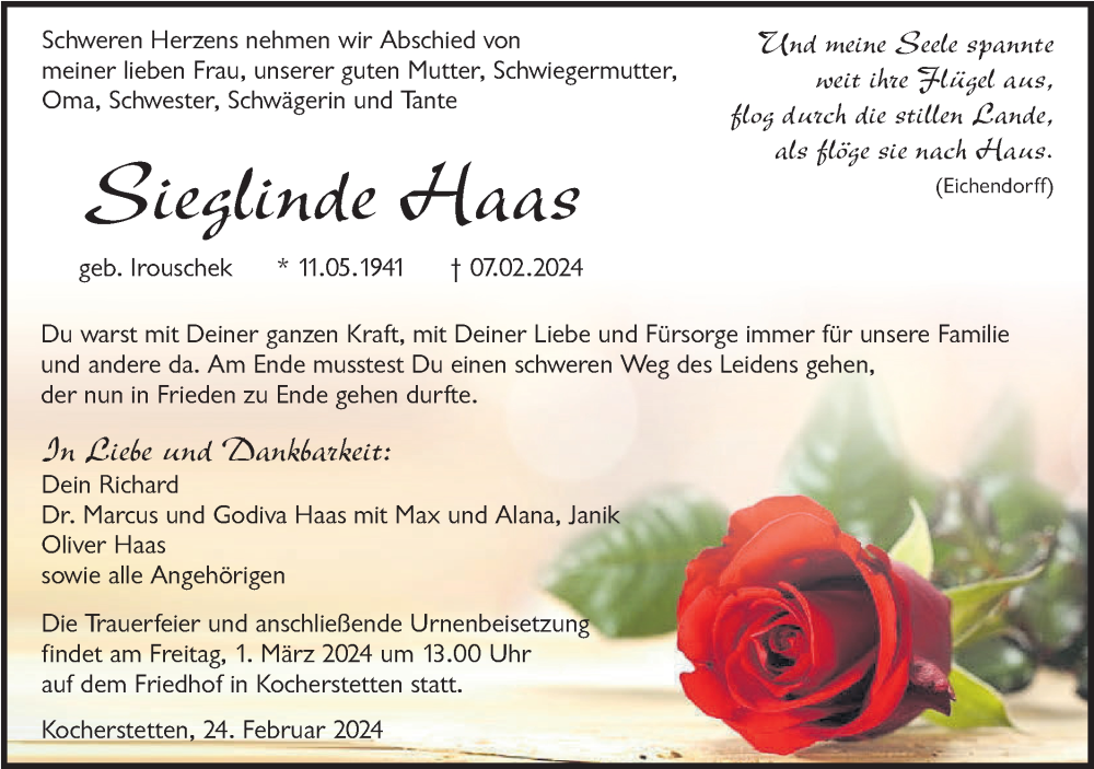 Hier finden Sie alle Traueranzeigen aus der Zeitung, die bisher für Sieglinde Haas erschienen sind. Weitere Traueranzeigen, die in der Zeitung erscheinen, werden hier ebenfalls aufgelistet