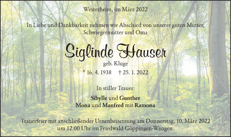 Hier finden Sie alle Traueranzeigen aus der Zeitung, die bisher für Siglinde Hauser erschienen sind. Weitere Traueranzeigen, die in der Zeitung erscheinen, werden hier ebenfalls aufgelistet