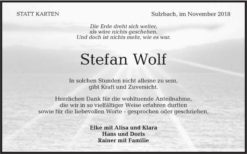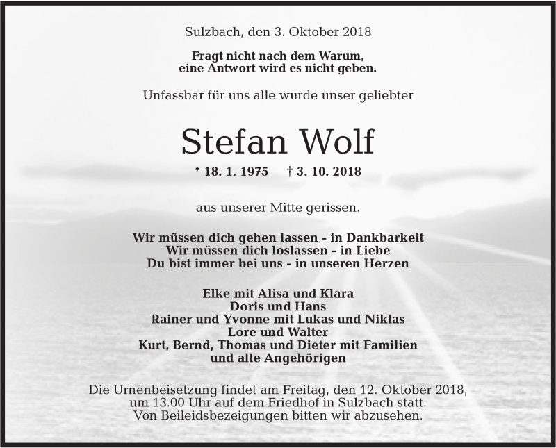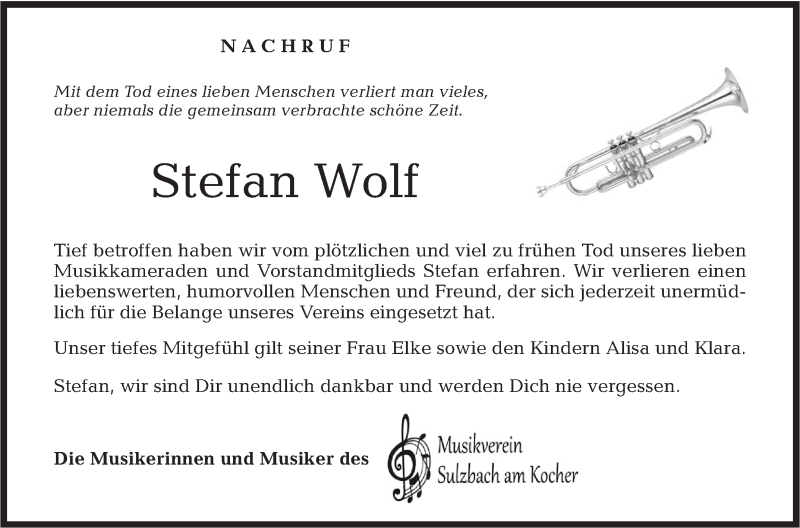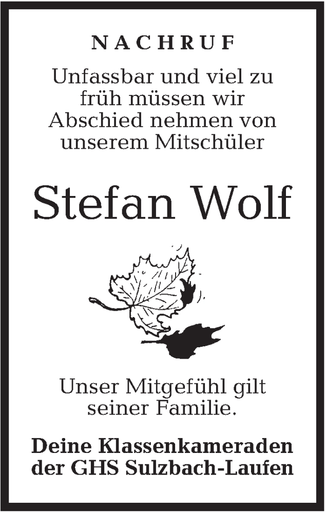 Hier finden Sie alle Traueranzeigen aus der Zeitung, die bisher für Stefan Wolf erschienen sind. Weitere Traueranzeigen, die in der Zeitung erscheinen, werden hier ebenfalls aufgelistet