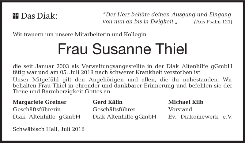 Hier finden Sie alle Traueranzeigen aus der Zeitung, die bisher für Susanne Thiel erschienen sind. Weitere Traueranzeigen, die in der Zeitung erscheinen, werden hier ebenfalls aufgelistet