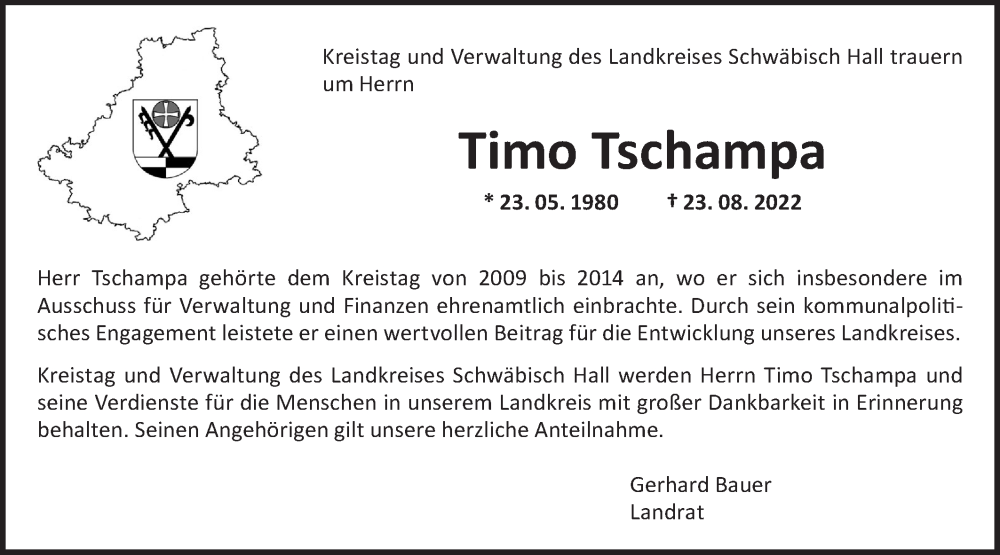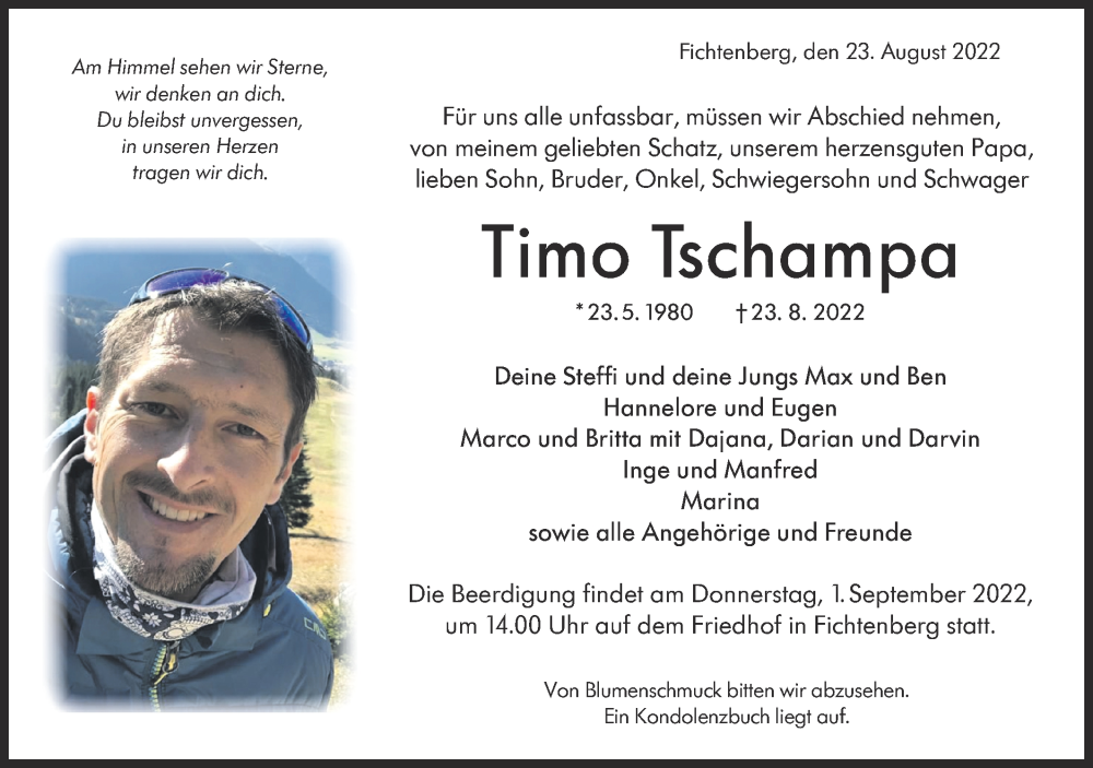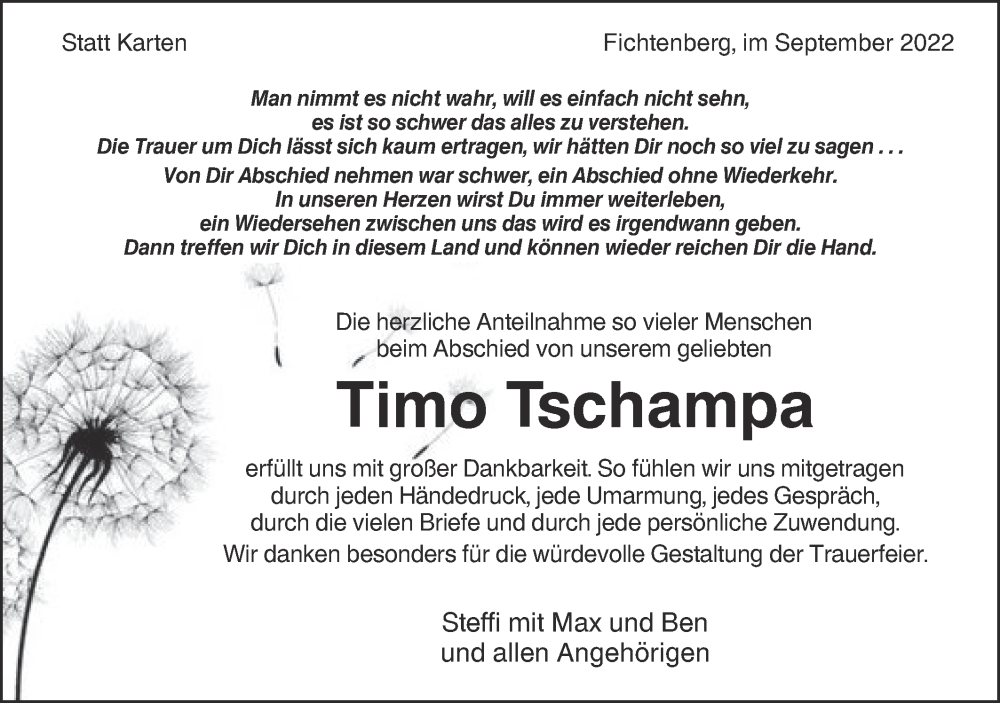 Hier finden Sie alle Traueranzeigen aus der Zeitung, die bisher für Timo Tschampa erschienen sind. Weitere Traueranzeigen, die in der Zeitung erscheinen, werden hier ebenfalls aufgelistet