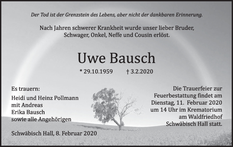 Hier finden Sie alle Traueranzeigen aus der Zeitung, die bisher für Uwe Bausch erschienen sind. Weitere Traueranzeigen, die in der Zeitung erscheinen, werden hier ebenfalls aufgelistet