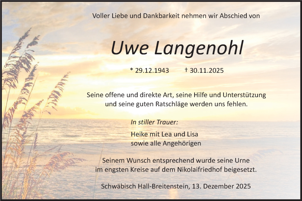 Hier finden Sie alle Traueranzeigen aus der Zeitung, die bisher für Uwe Langenohl erschienen sind. Weitere Traueranzeigen, die in der Zeitung erscheinen, werden hier ebenfalls aufgelistet