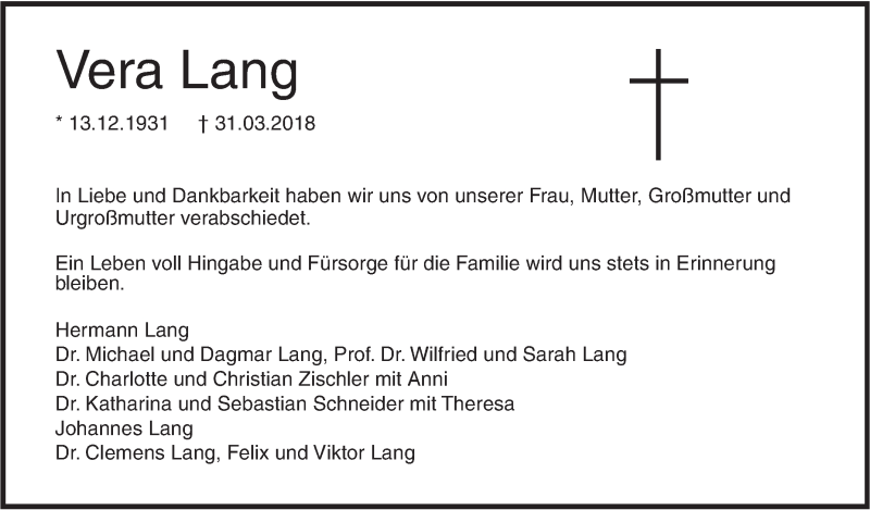 Hier finden Sie alle Traueranzeigen aus der Zeitung, die bisher für Vera Lang erschienen sind. Weitere Traueranzeigen, die in der Zeitung erscheinen, werden hier ebenfalls aufgelistet