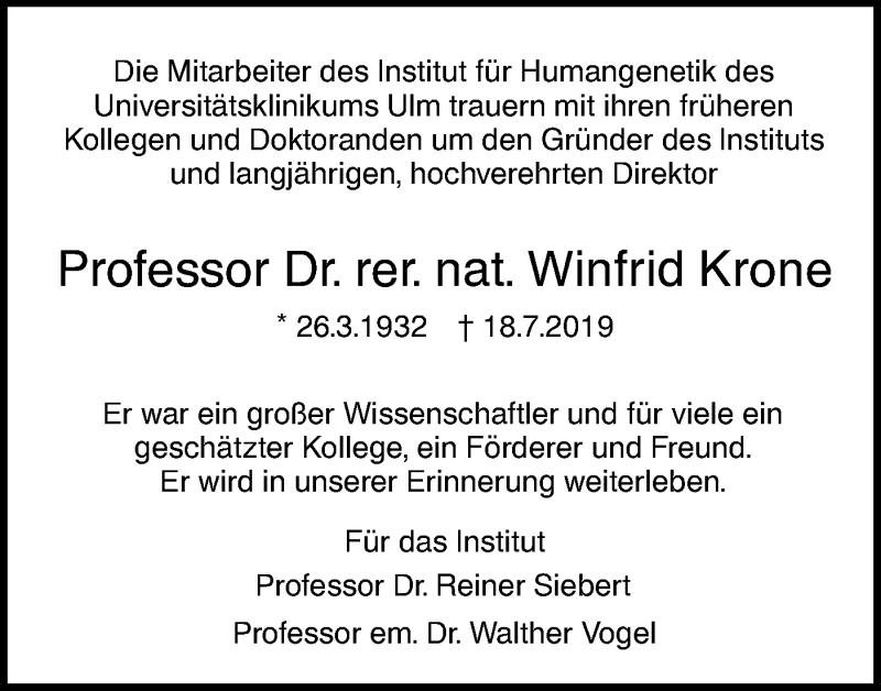 Hier finden Sie alle Traueranzeigen aus der Zeitung, die bisher für Winfrid Krone erschienen sind. Weitere Traueranzeigen, die in der Zeitung erscheinen, werden hier ebenfalls aufgelistet